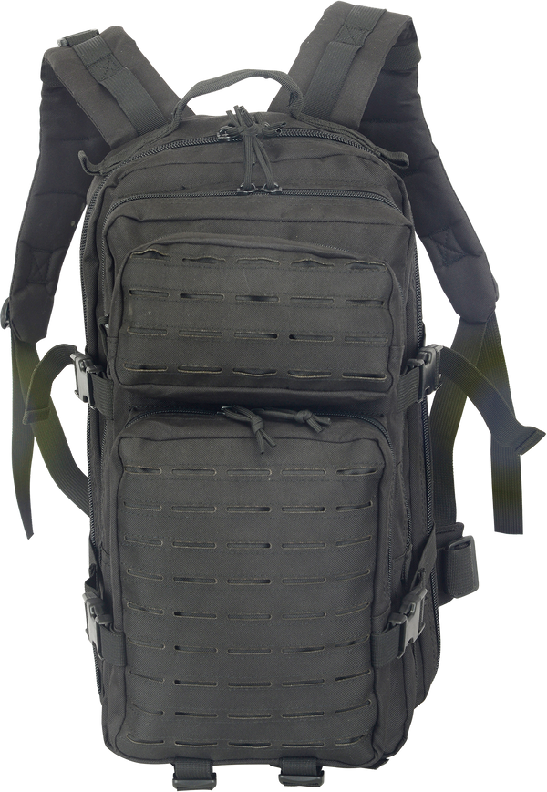 Y-compression strap made from 1" webbing. 2 rows, 5 channels of PALS webbing. 3 channels of 2" webbing loops. Bungee cord retention. Breathable padding for comfort. 1 mesh side pouch...
