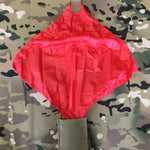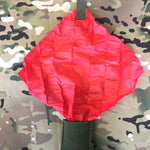 If you've been hit you can send a signal with these brightly colored red "dead" rags. These rags are used for safety and are required at many arenas and fields to help prevent already shot players from getting shot again once they are out of the game. They also help signal to anyone who can see it that you are on your way back to respawn. Many times they are stored in pockets, pouches, and self-contained sleeves, they're often placed on the top of the head or around the end of the gun when a player is eliminated.