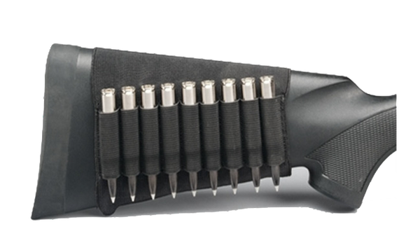 The NFG Elite Butt stock Rifle Cartridge Holder is a simple design that stretches to fit most shotguns. The bottom seam is stitched and wrapped to prevent unraveling when cut to allow access to the sling swivel stud. High-strength elastic loops keep 9 rounds secure and within easy reach. Installation note: Ensure your gun is unloaded, then slide the carrier on from the muzzle end. It will not stretch enough to slide over the toe of the butt stock.