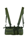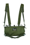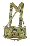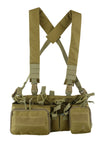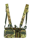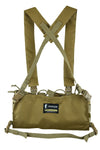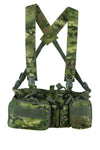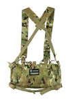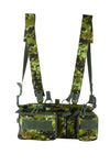 The NFG Strategic Comanche Chest Rig is designed to work as a compact Chest Rig in standalone configuration. The rifle magazine pouches accept almost any .308 magazine. The Multi-Mission Pouches accept 1911, Glock, Sig, M&P, XD and other standard double or single stack pistol magazines, as well as many handheld lights and multi-tools. Zipper GP and Utility pouches.