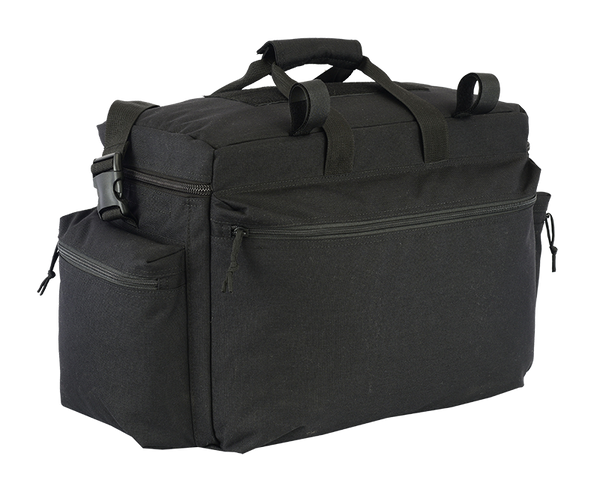 An ideal patrol bag for your front seat or trunk, the NFG Elite Patrol Bag keeps all your essential gear and accessories within easy reach. Perfect for Highway Patrol, NFGEriffs, or lone patrol officers, the Patrol Ready Bag features an adjustable main compartment divider that allows you to adapt your storage space instantly, a removable heavy duty shoulder strap for easy carry in any environment, and durable grab-and-go nylon handles for quick disembarkation. Multiple organizer pockets are sized for common accessories, including water bottles, magazines, pens, papers, and electronics. A transparent ID panel allows quick ID, and tough 600D PU*2 DWR coated cordura with closed cell foam and kydex padding all over the pack construction keeps your gear safe and secure in any climate. SPECIFICATIONS All-weather 600D Polyester 18.5' X 8' X 12' main compartment YKK® zippers Transparent ID/business card window Loop and hook side panel FEATURES Versatile and customizable police patrol bag Two Water Bottle Pockets Two Side Pockets Two End Pockets Two zippered pockets on lid Integrated organizer Durable nylon carrying handles with secure closure Removable shoulder strap with heavy duty clips