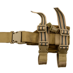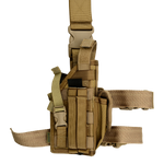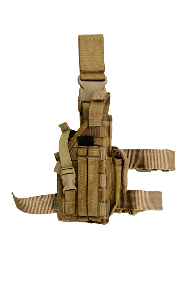 The NFG Elite Drop Leg Universal Pistol Holster has a quick release pistol-grip strap for extra retention. A single pistol mag pouch on the front with adjustable flap for large cap mags, the holster attaches to the belt via an adjustable extender with fastex buckle, and to the leg with two adjustable Nylon straps with anti slip bands and fastex buckles. The extender and the leg straps may be removed in order to attach the holster directly to the belt.