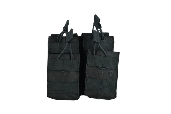 The NFG Strategic Double Stacker open-top Mag Pouch is a convenient modular attachment that accommodates four M4 or M16 magazines in a stacked configuration. This mag pouch attaches easily to battle belts, tactical vests and other webbing platforms thanks to four MOLLE straps on the rear. Featuring a rugged 600D PU*2 DWR coated construction designed to handle constant abuse, this pouch is ultra-durable. It’s also constructed with bungee pull-tab cords that ensure the magazines sit securely in place, making this pouch a safe option for your extra ammunition. These bungee cords also allow the tops of the pouch to open rapidly for easy magazine retrieval and replacement.